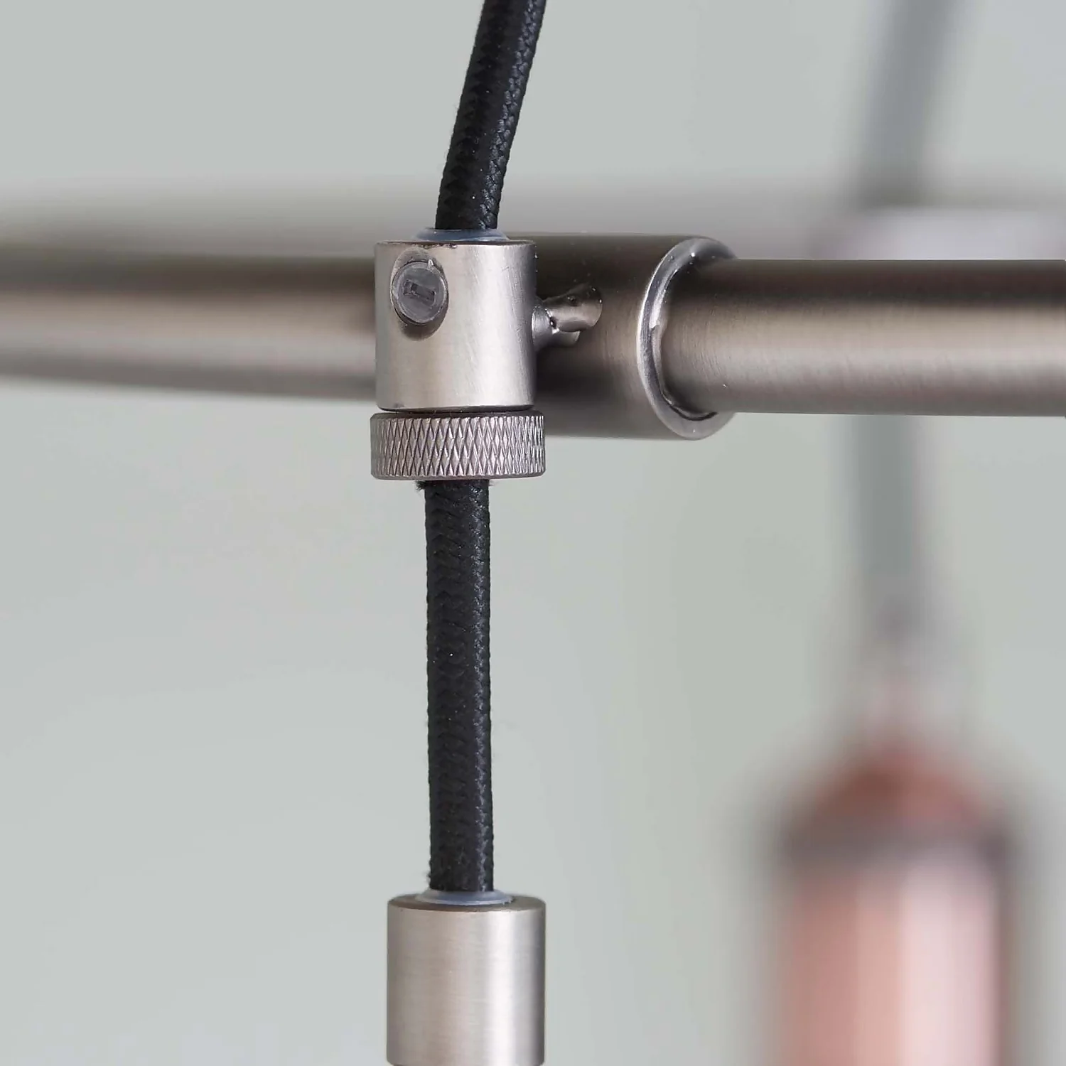 An industrial styled pendant light, finished in aged pewter and aged copper, making it bang up to date with on-trend ‘resto’ styling. Height adjustable, suspended from black fabric flex with authentic knurled lamp holder details. Perfect when paired with filament LED lamps.