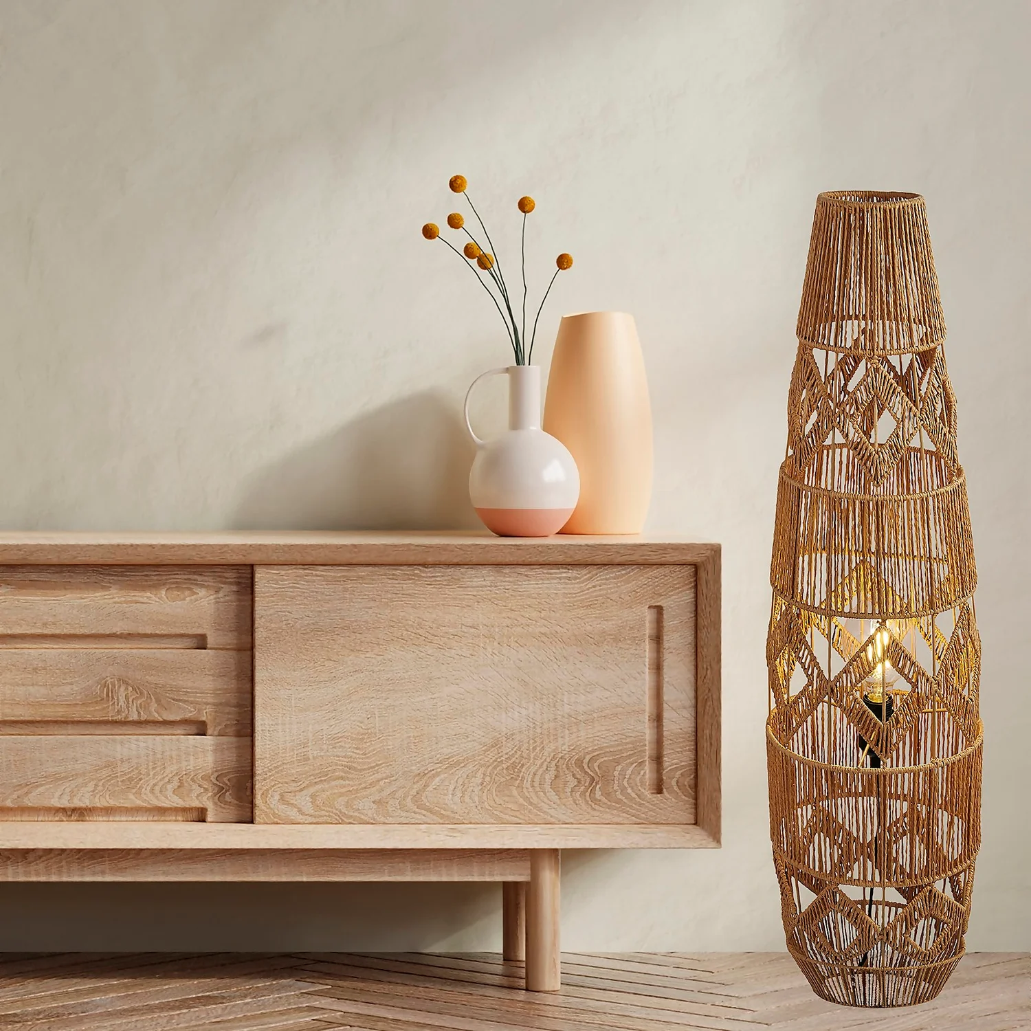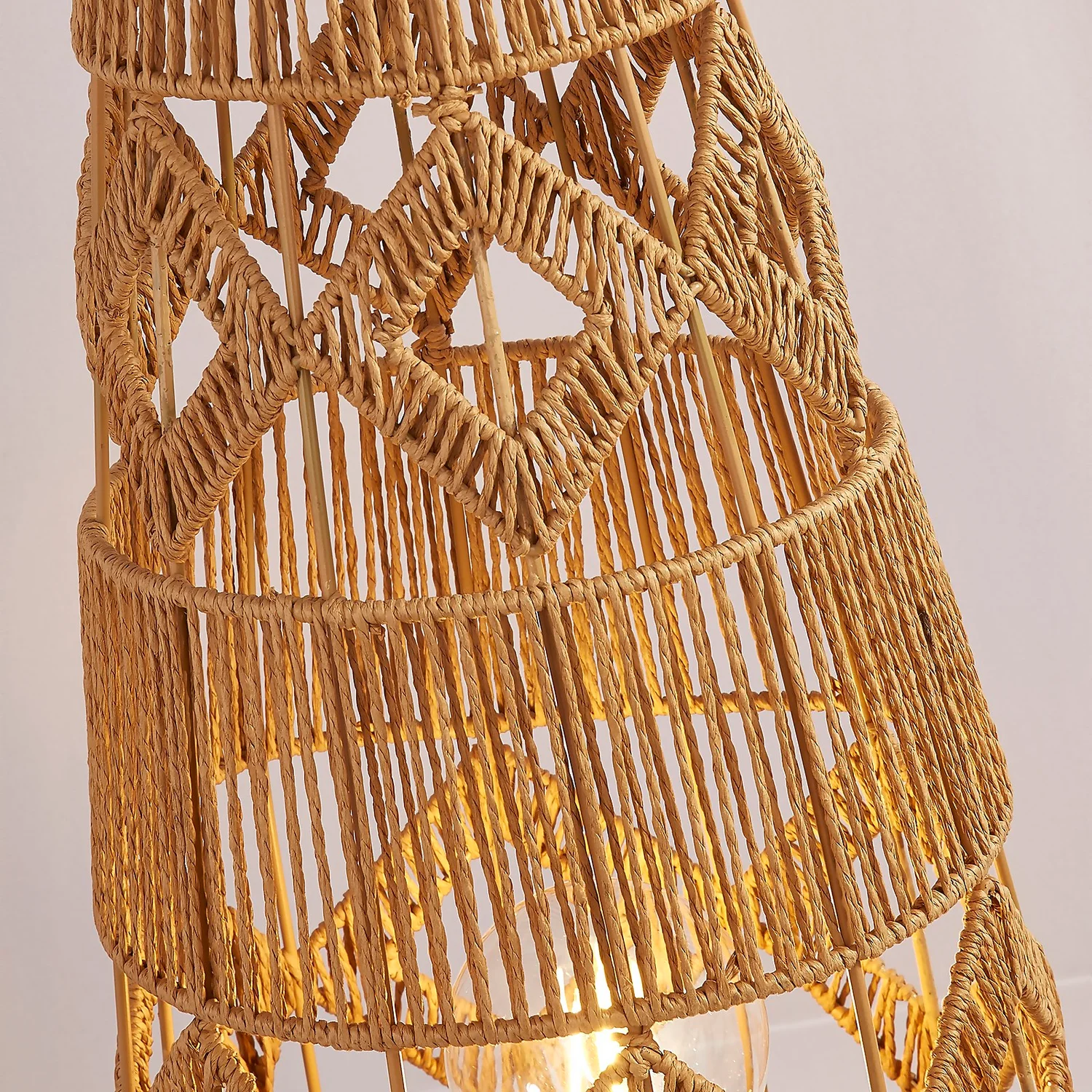 The Kai floor lamp is a perfect natural woven rattan with geometric design.