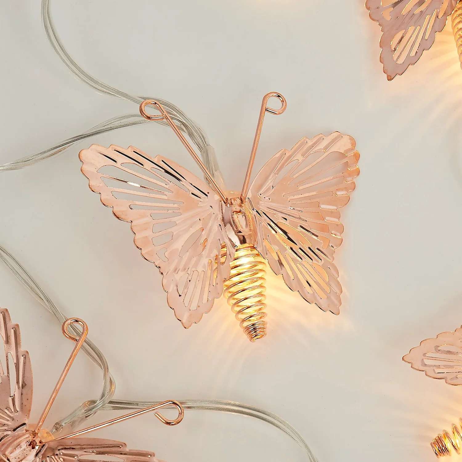 Delicately crafted butterflies finished in a rose gold colour flutter along this 2m garland and are interspersed with 20 warm white fairy lights.